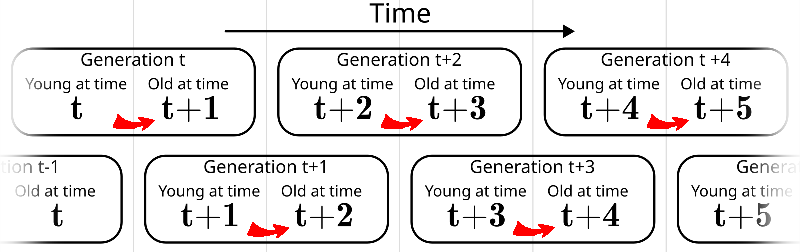 • Generation $t$ is young at the same time that generation $t-1$ is old. Generation $t$ is old at the same time generation $t+1$ is young.