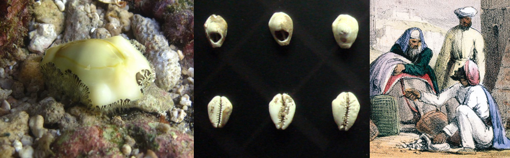 Left: Live money snail. CC-BY-SA-5 Philippe Bourjon. Center: Ancient Chinese Shell Money. CC-BY-SA-3 PHGCOM. Right: Lithograph of traders using shells. 1845