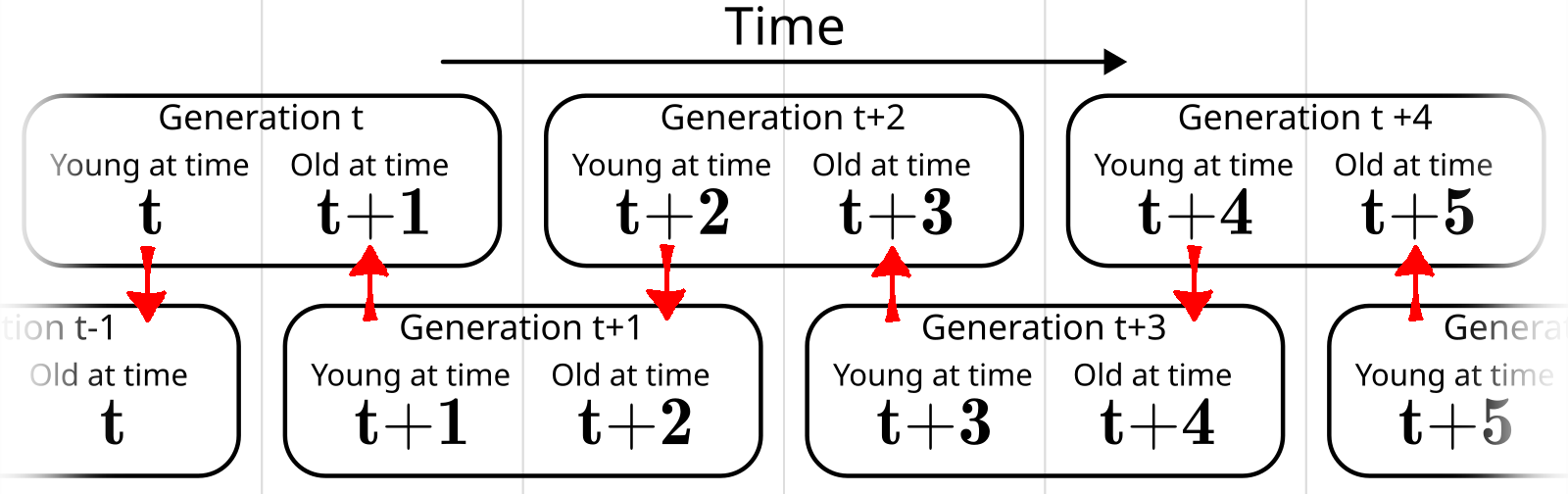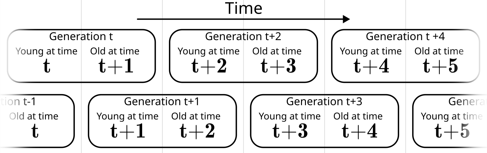 • Generation $t$ is young at the same time that generation $t-1$ is old. Generation $t$ is old at the same time generation $t+1$ is young.